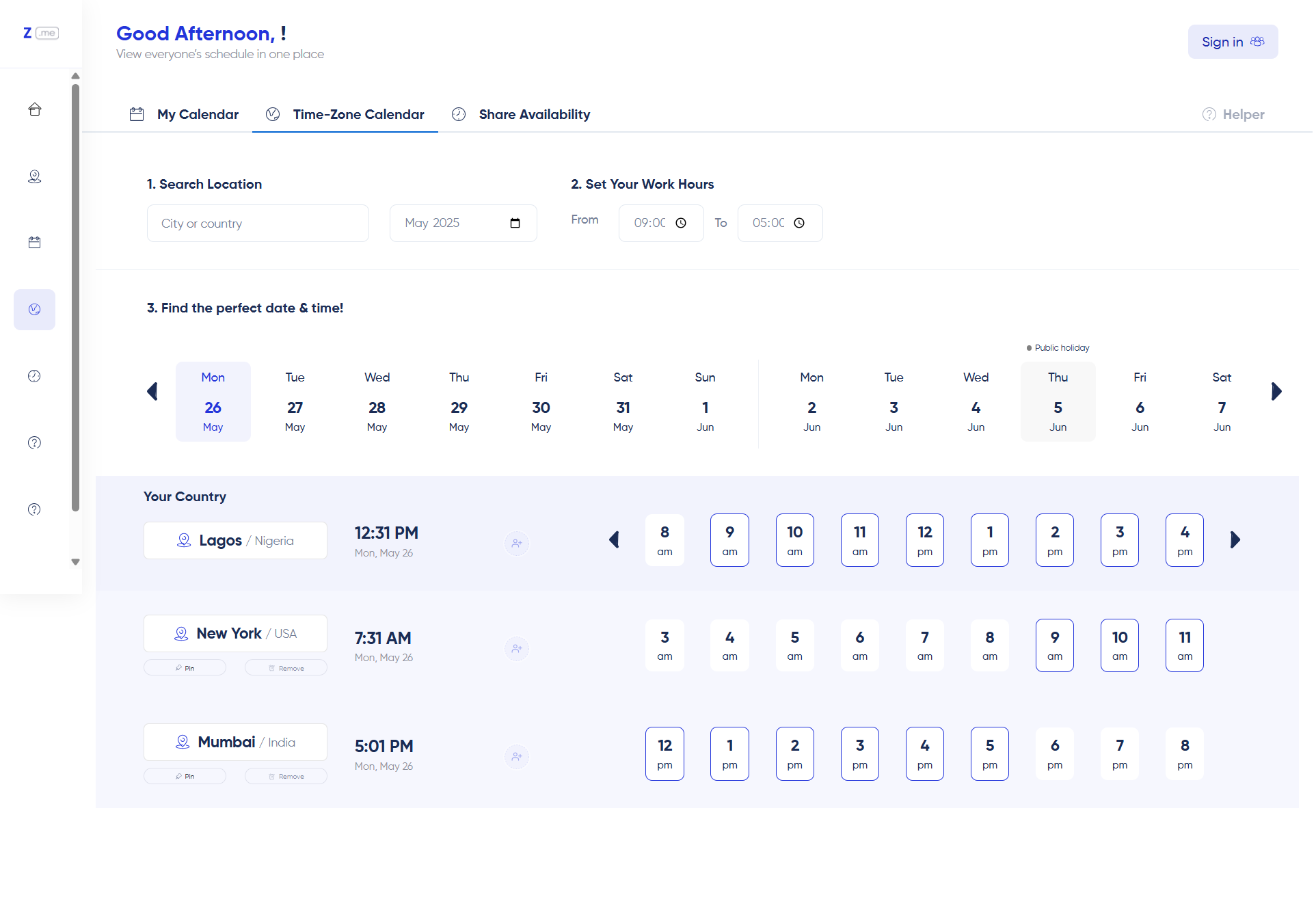 Team productivity tool for scheduling across time zones. Developed all backend APIs with Google Calendar integration.